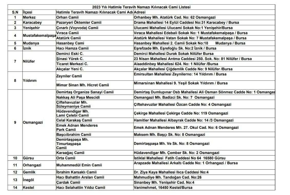Camiler Bursa İl Müftülüğü tarafından belirlenirken, hatimle teravih kılınacak camiler şöyle: