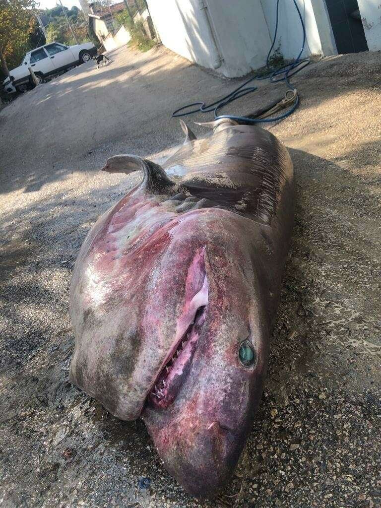 Mudanya ilçesi Altıntaş Köyü açıklarında balıkçıların ağına takılan cam göz cinsi köpek balığı takıldı. Dev köpekbalığı görenleri şaşkına uğrattı.