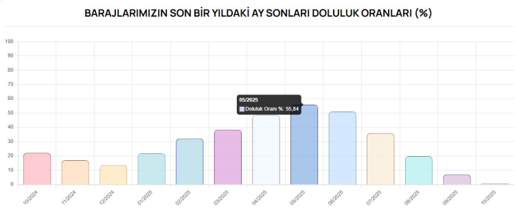 Ancak alınan tüm önlemlere rağmen barajlarda su kalmadı. 2024 yılının Ekim ayında %22,09 olarak kaydedilen doluluk oranı, 2025’te aynı dönemde %0’a düştü. Oysa bu yılın Mayıs ayında barajlar %55,84 doluydu.
