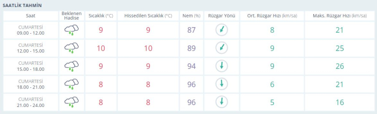 21.00 – 24.00: Yağmurlu, 8°C, nem %96