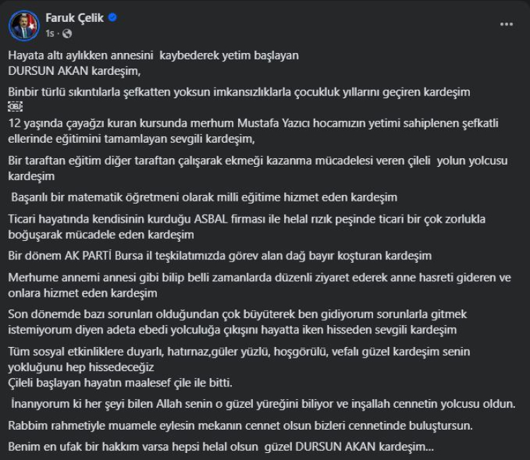 AK Parti Artvin Milletvekili Faruk Çelik ise kapsamlı bir mesaj paylaşarak, Akan’ın hayat mücadelesine ve kişiliğine vurgu yaptı.