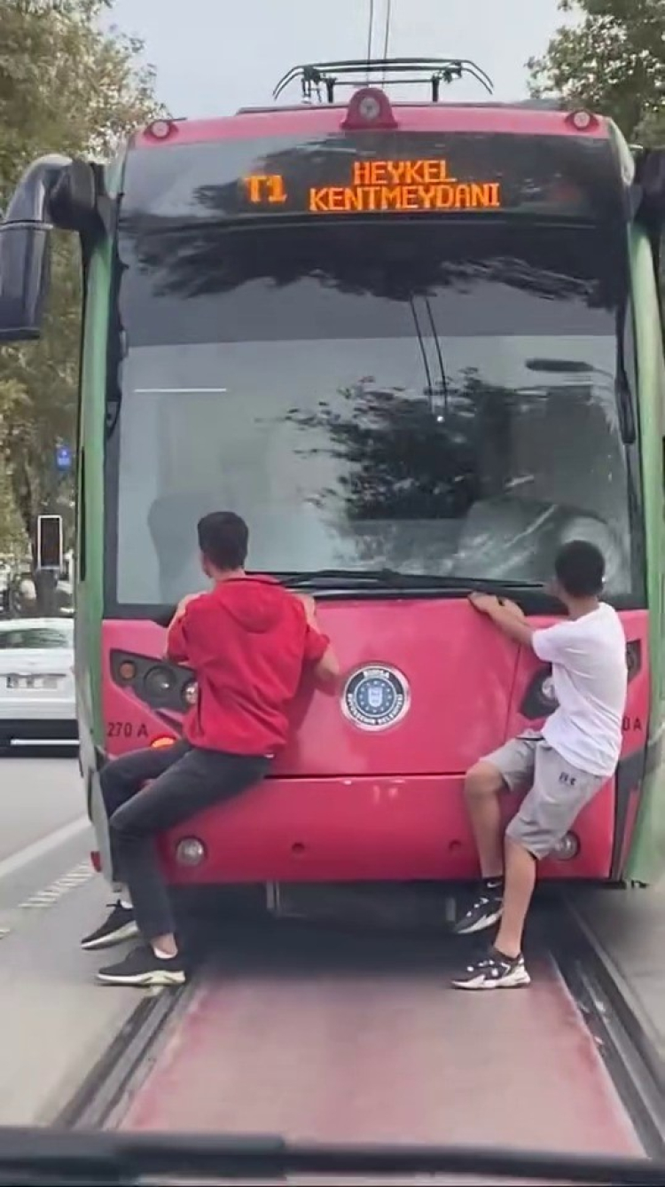 Tramvayın arkasına gizlice yaklaşarak tutunan çocukların bu tehlikeli yolculuğu, seyir halindeki başka bir araçtaki kişiler tarafından kayda alındı. Görüntülerde, çocukların düşme riskine rağmen oldukça rahat ve umursamaz tavırlar sergilediği dikkat çekti.