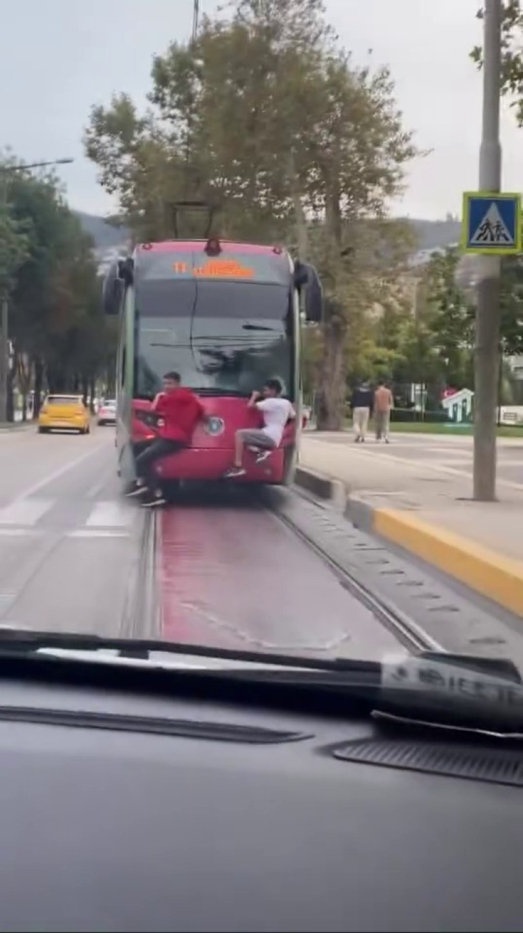 Bursa’da bu görüntü ilk değil! Tramvayın arkasına tutunarak gittiler