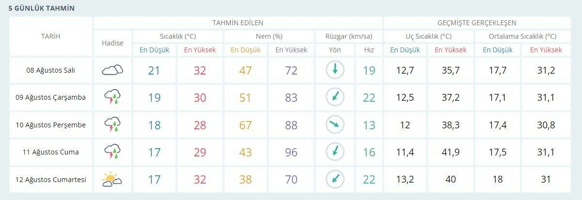 Yayınlanan rapora göre, bugün (8 Ağustos) en yüksek sıcaklık 32, en düşük sıcaklık ise 21 olacak. Nem oranının ise 72 olması bekleniyor.