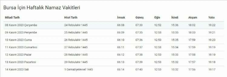 BURSA NAMAZ VAKİTLERİ 2023 HAFTALIK TABLO:
