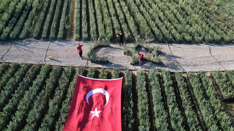 Bursa’nın İznik ilçesinde, Cumhuriyetin 101. yılını kutlamak amacıyla bir işletmeci özel bir etkinlik düzenlendi. Fidan işletmecisi Sinan Demircan, zeytin bahçesine dev Türk Bayrağı açarak, zeytin fidanlarıyla bayrağın simgesi olan ay ve yıldızı oluşturdu.