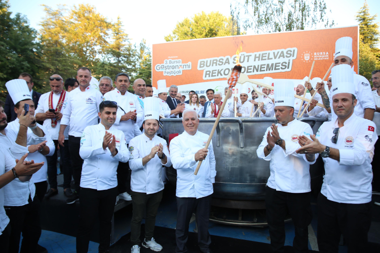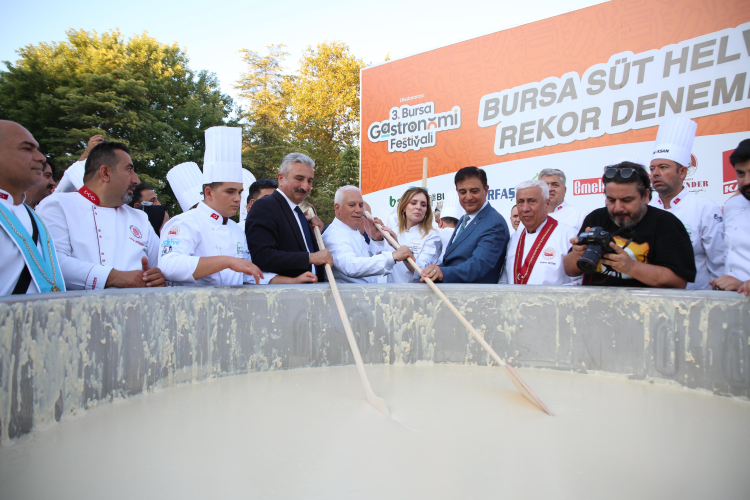 Bursa Büyükşehir Belediyesi'nin düzenlediği 3. Bursa Uluslararası Gastronomi Festivali'nde, Türkiye’nin dört bir yanından gelen yaklaşık 150 şefin katkılarıyla ‘Bursa Süt Helvası’ için rekor denemesi yapıldı. Dev kazanda hazırlanan 5 tonluk süt helvası, Başkan Mustafa Bozbey tarafından ziyaretçilere sunuldu.