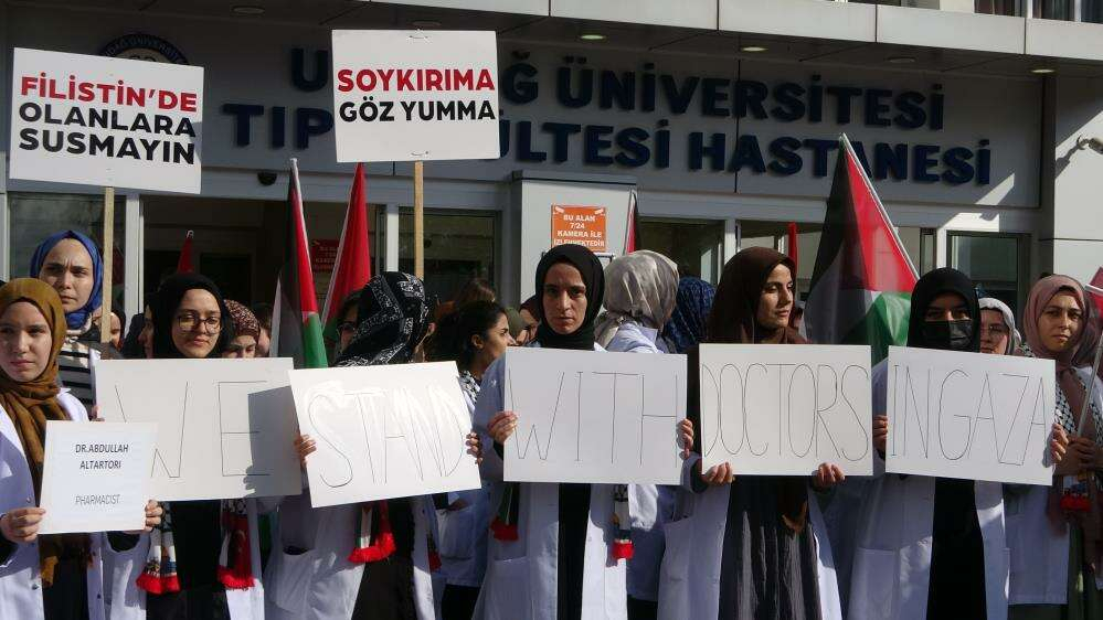İsrail'in Gazze'ye yönelik saldırıları ve hastanelerin bombalanarak masum insanların şehit edilmesi Uludağ Üniversitesi Tıp Fakültesi öğrencileri, Uluslararası Doktorlar Derneği (AID) ve Sağlıkta İyilik Hareket Topluluğu öncülüğünde Uludağ Üniversitesi önündeki basın açıklamasıyla telin edildi.