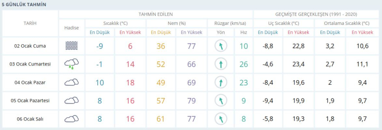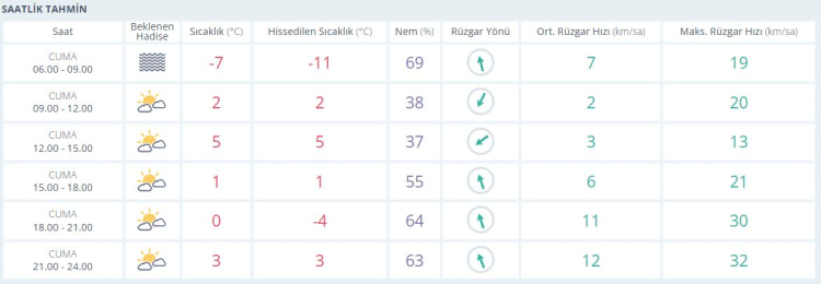 Öğleden sonra sıcaklık yeniden düşüşe geçiyor. 15.00 – 18.00 saatlerinde hava 1 derece, akşam saatlerinde ise hissedilen sıcaklık -4 dereceye kadar geriliyor. Günün ilerleyen saatlerinde rüzgar hızının 30-32 km/sa seviyelerine ulaşması bekleniyor.