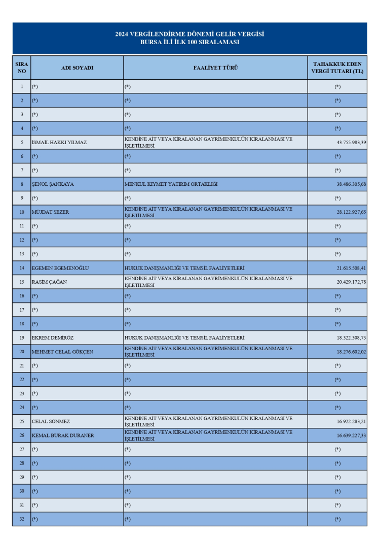2024 VERGİLENDİRME DÖNEMİ GELİR VERGİSİ BURSA İLİ İLK 100 SIRALAMASI