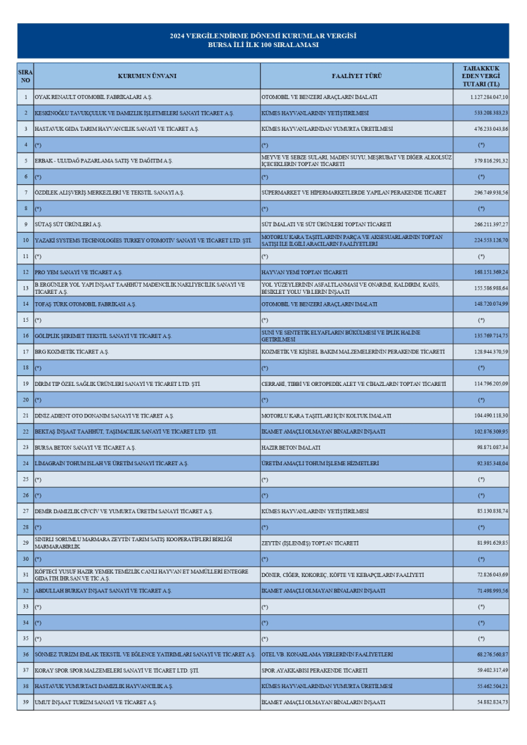 Gelir İdaresi Başkanlığı Bursa Defterdarlığı tarafından 213 sayılı Vergi Usul Kanunu’nun 5’inci maddesi ve 561 Sıra No.lu Genel Tebliğ kapsamında açıklanan verilere göre, 2024 vergilendirme döneminde Bursa genelinde en fazla kurumlar ve gelir vergisi beyan eden şirketler ile isimler belli oldu.