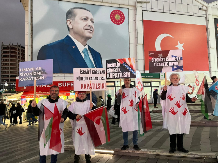 Türkiye’nin İsrail ile yapılan tüm anlaşmaları ve arabuluculukların bitirilmesi gerektiğini vurgulayarak yetkililere sesleniyorlar. Beyaz bir önlüğün üzerinde yer alan kanlı el sembolleri ile yaşanan katliama dikkat çekiyorlar.