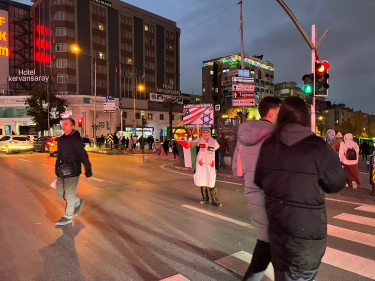 Filistin’de yaşanan zulme karşı farkındalık oluşturmak için her akşam bir araya geldiklerini dile getiren Matematik Öğretmeni Yavuz Süslü, “Türkiye’nin limanlarında hala ticaret devam ediyor. İsrail dur durak bilmiyor. Önce Filistin, Lübnan, Suriye derken bizim ülkemize de göz dikecekler. Dünyanın gözleri önünde çok büyük bir katliam yaşanıyor. Filistin halkı direniyor. Pes etmiyor. Anneleri, babaları, çocukları gözleri önünde ölüyor. Ama vatanı bırakmıyorlar. Biz onların davasına destek olmak ve orada yaşanan zulme karşı ses olmak için burada vatandaşları bilinçlendiriyoruz. Bizim yetkililerden İsrail ile gerek doğrudan gerekse dolaylı yoldan yapılan tüm ticareti sonlandırmalarını istiyoruz. Muhalefetin mücadele eden Hamas’ı terörist olarak göstermesi kabul edilir bir şey değil. Terörist olarak niteledikleri o grup bir mücadele veriyor.” dedi.