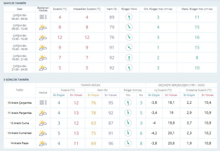 10 Aralık Çarşamba: Puslu. Sıcaklıklar 4°C / 12°C