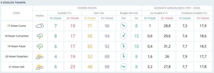 19 Nisan Pazar günü de yağış devam edecek ve benzer sıcaklık değerleri görülecek.