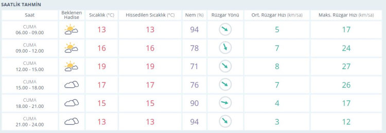 Cuma sabah saatlerinde (06.00 – 09.00) parçalı bulutlu bir gökyüzü beklenirken sıcaklık 13 derece civarında olacak. Nem oranı ise oldukça yüksek seyredecek.