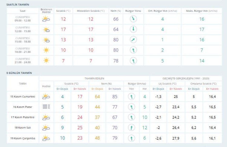 15 Kasım Cumartesi: Parçalı bulutlu bir hava etkili olacak. Sıcaklıklar 4°C ile 17°C arasında değişecek.