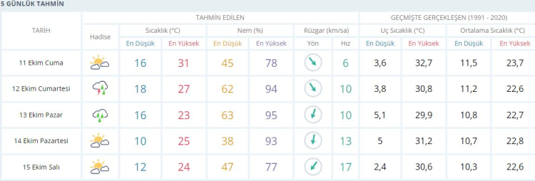 11 Ekim Cuma günü parçalı bulutlu bir hava bekleniyor. Sıcaklık 16°C en düşük, 31°C en yüksek olacak.