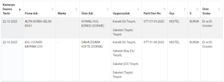 Tarım ve Orman Bakanlığı, taklit ve tağşiş listesini güncelleyerek Bursa’da vatandaşlara sakatat yediren firmaları açıkladı. Kestel ilçesindeki iki gıda işletmesinin kıymalı ürünlerinde kanatlı eti ve taşlık, baş, dil gibi sakatat çeşitleri tespit edildi. İşte o firmalar ve skandal detaylar.