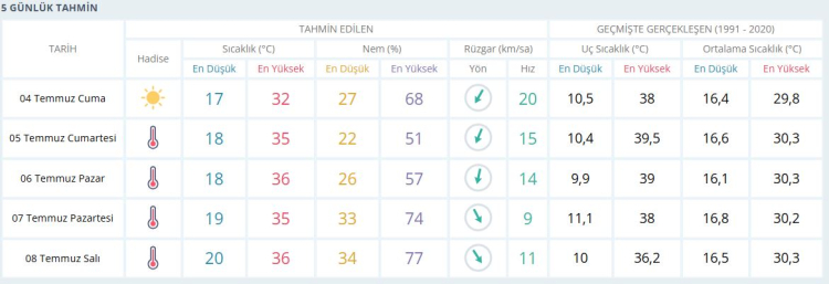 5 Temmuz Cumartesi: Sıcak hava etkisini artırıyor. En yüksek sıcaklık 35°C, nem %51’e kadar düşüyor.