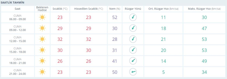 Meteoroloji verilerine göre, gün boyunca sıcaklıklar hızla yükselirken nem oranı öğle saatlerinde düşüyor, rüzgar ise zaman zaman etkili oluyor. Sabah 06.00 ile 09.00 saatleri arasında sıcaklık 23°C seviyelerinde seyrederken, hissedilen sıcaklık da aynı düzeyde kalacak. Güne serin ama açık bir havayla başlanacak.