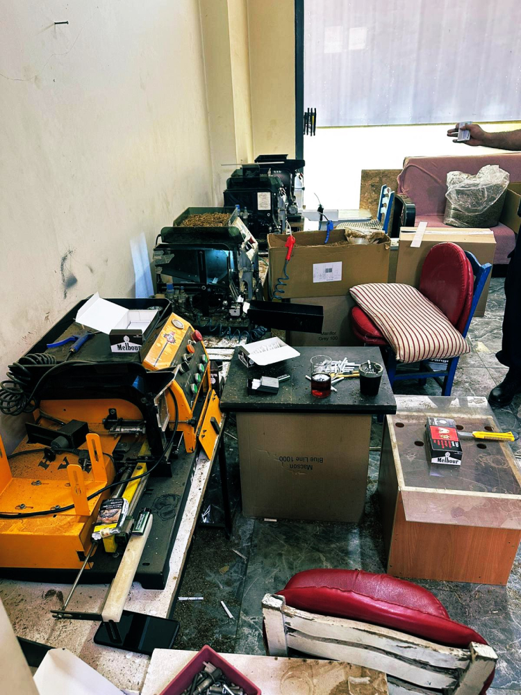 Aramalar sonucu; 80.000 adet tütün basılı sigara, 301.400 adet makaron, 173 kilogram kıyılmış tütün, 47.400 adet boş sigara kutusu, 4.800 adet sigara filtresi, 10 adet elektronik sigara basma makinesi, 4 adet kompresör, 2 adet hava makinası ele geçirildi.