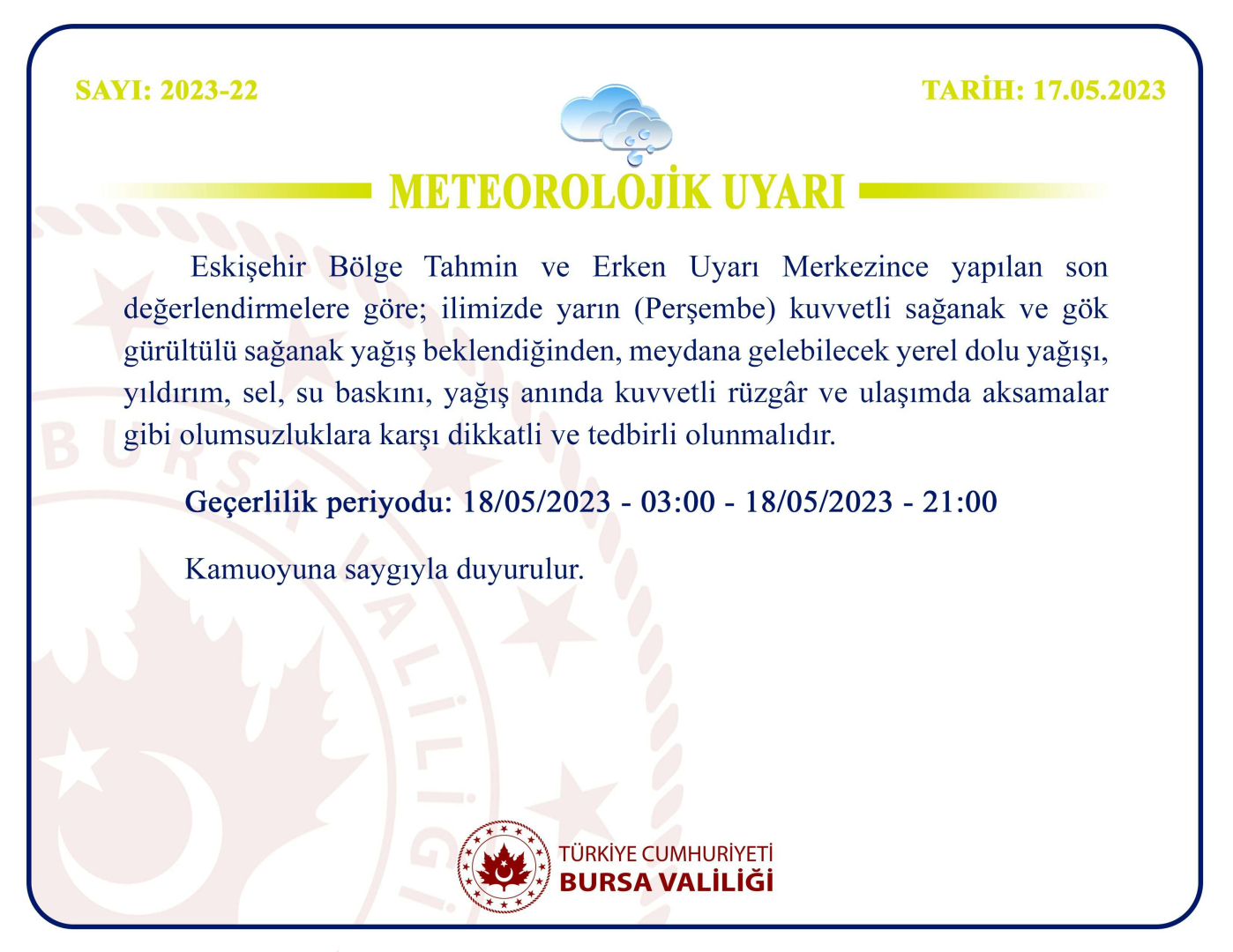 Hava durumu potansiyel tehlikelidir: Tahmin edilen meteorolojik hadise olağandışı olmamakla birlikte, meteorolojik şartlardan etkilenebilecek faaliyetler konusunda dikkatli olunmalıdır.