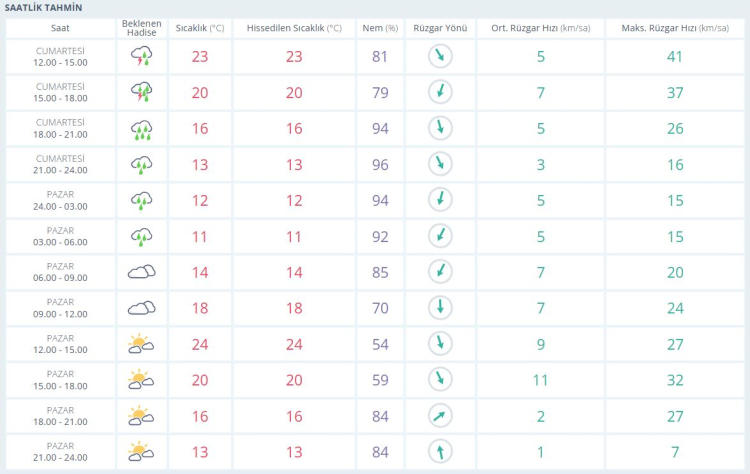 Cumartesi günü öğle saatlerinde gök gürültülü sağanak yağış ile birlikte hava sıcaklığı 23°C olacak. Nem oranı %81 seviyelerinde seyrederken, rüzgar ortalama 5 km/sa hızla esecek, ani rüzgarlar 41 km/sa hıza kadar ulaşabilecek.