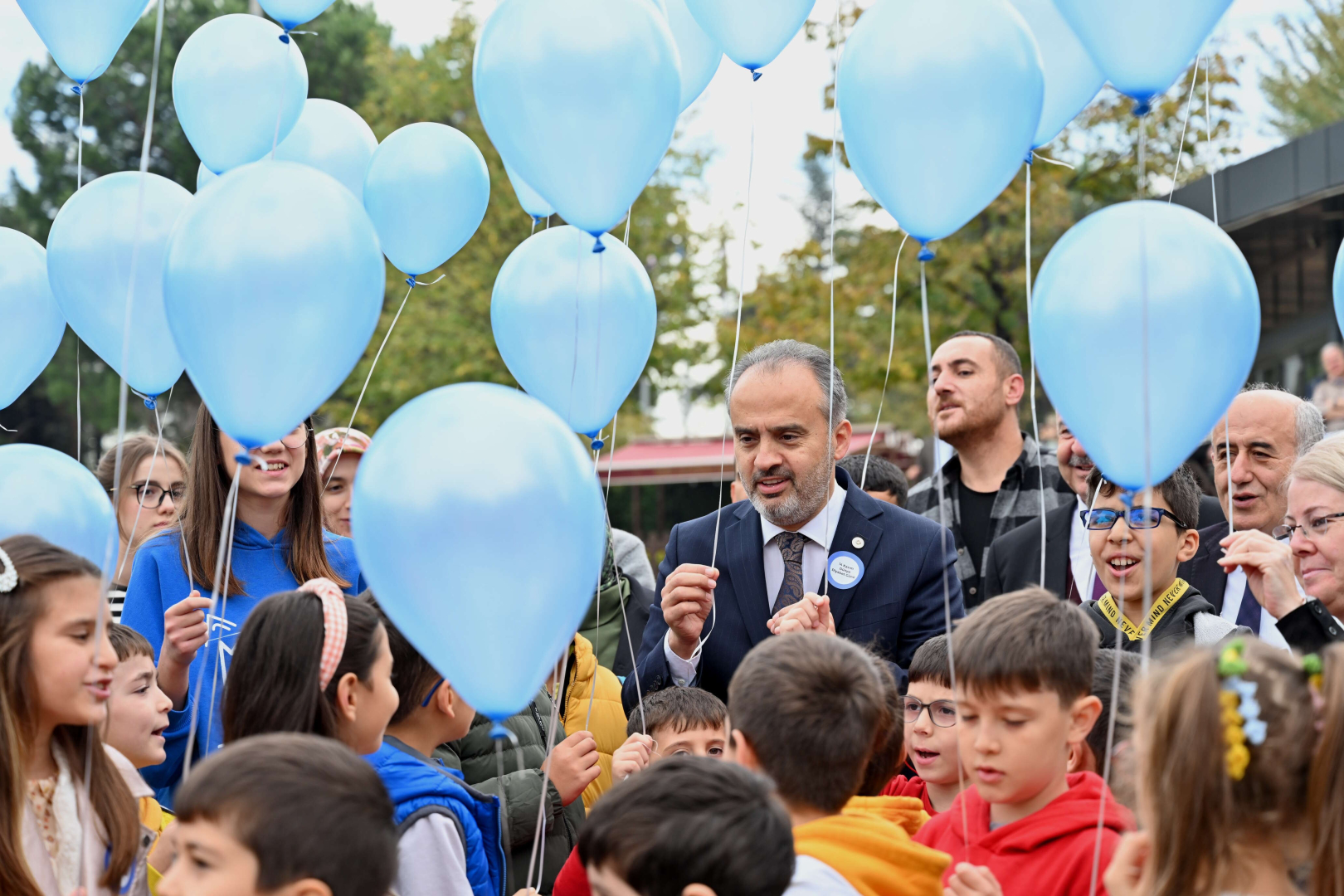 Bursa'da diyabet hastalığıyla mücadele eden çocuklar, mavi balonları Filistinli çocuklar için gökyüzüne bıraktı.