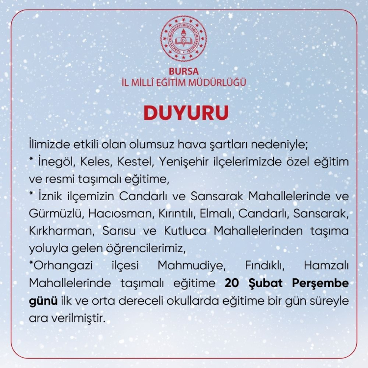 Orhangazi ilçesi Mahmudiye, Fındıklı, Hamzalı Mahallelerinde taşımalı eğitime 20 Şubat Perşembe günü ilk ve orta dereceli okullarda eğitime bir gün süreyle ara verilmiştir.’ denildi.