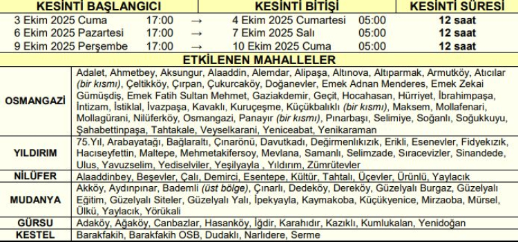 BURSA SU KESİNTİSİ 3 EKİM 2025 CUMA