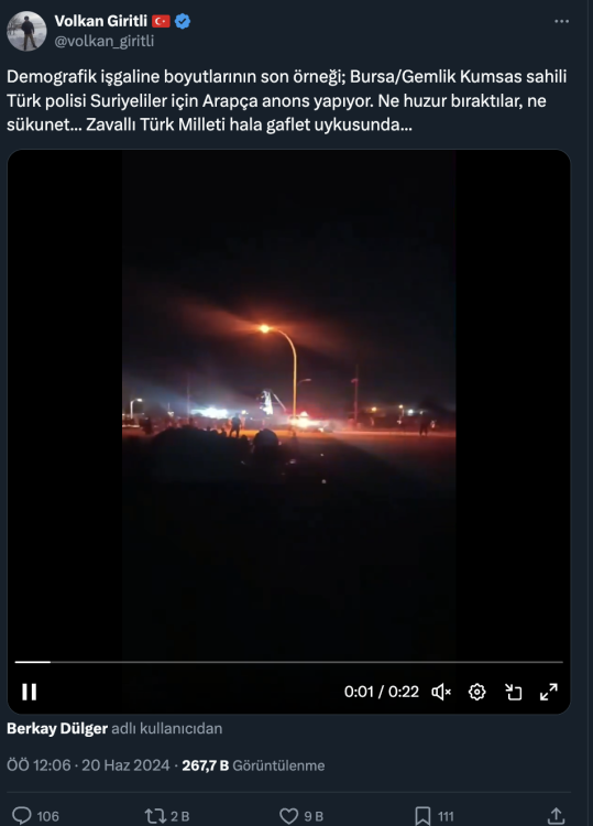 Bazı X (eski adıyla Twitter) kullanıcıları, Bursa'nın Gemlik ilçesindeki Kumsas plajı çevresinde devriye gezen polisin, Arapça anons yaptığı anları gösterdiği iddia edilen bir videoyu 20 Haziran 2024 tarihinde dolaşıma soktu. Bir sosyal medya kullanıcısı videoyu, "Demografik işgalin boyutlarının son örneği. Bursa/Gemlik Kumsas sahili Türk polisi Suriyeliler için Arapça anons yapıyor. Ne huzur bıraktılar, ne sükunet. Zavallı Türk Milleti hala gaflet uykusunda." ifadeleriyle takipçilerine servis etti ve yaklaşık 270 bin görüntüleme aldı.