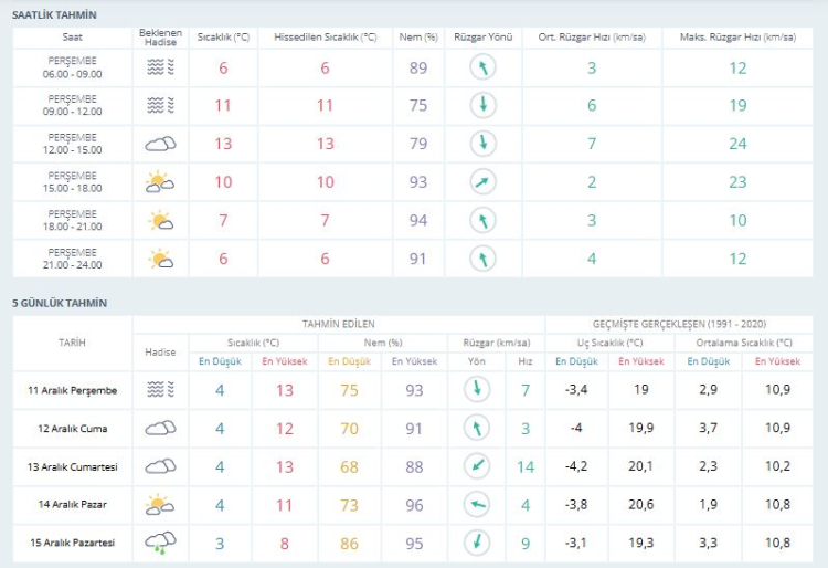 11 Aralık Perşembe: Puslu. Sıcaklıklar 4°C / 13°C