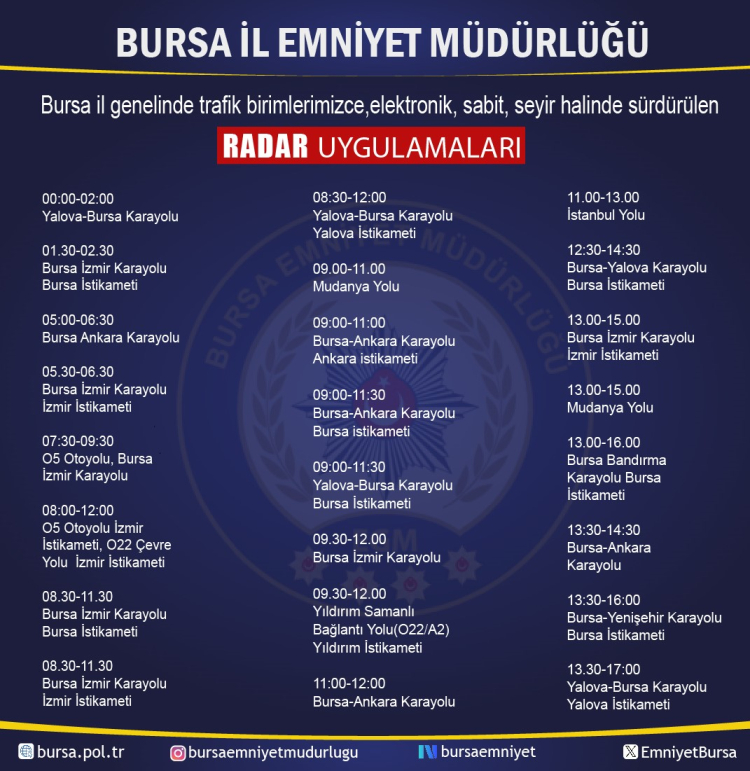 Bursa İl Emniyet Müdürlüğü tarafından yapılan resmi açıklamaya göre, 7 Şubat 2026 tarihinde şehrin ana arterlerinde ve bağlantı yollarında elektronik, sabit ve seyir halinde radar uygulamaları yürütülecek.