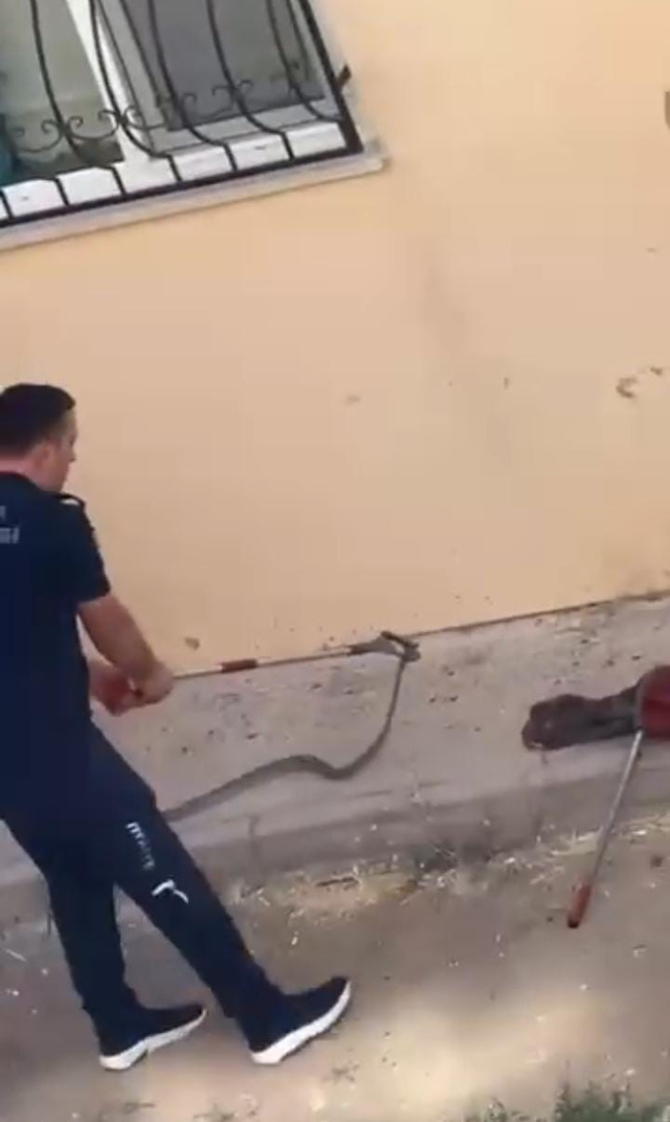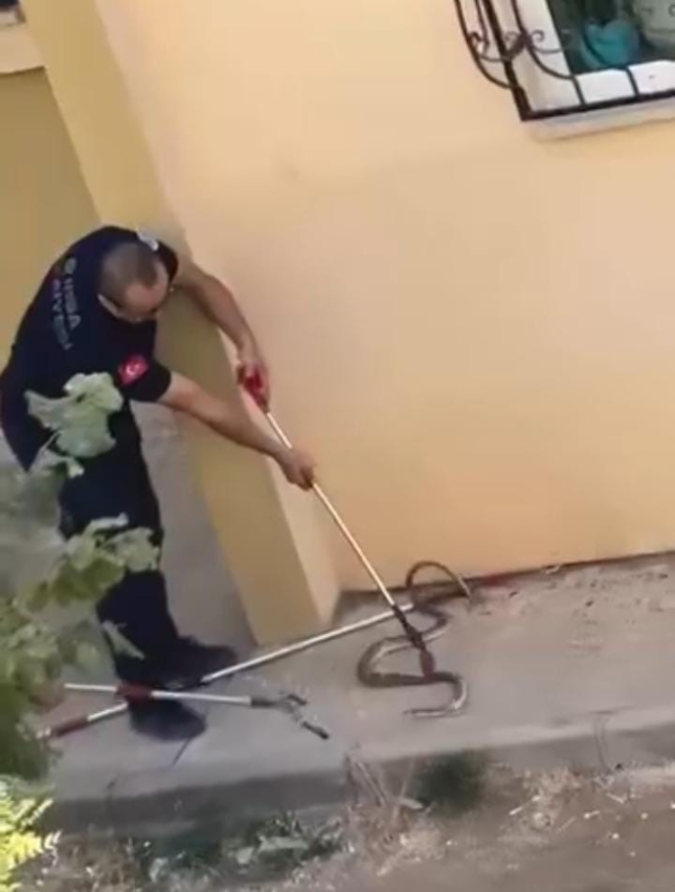 Yılanı gören site sakinleri durumu vakit kaybetmeden itfaiye ekiplerine bildirdi. Olay yerine kısa sürede ulaşan ekipler özel ekipmanlar kullanarak yılanı kontrollü şekilde yakaladı.