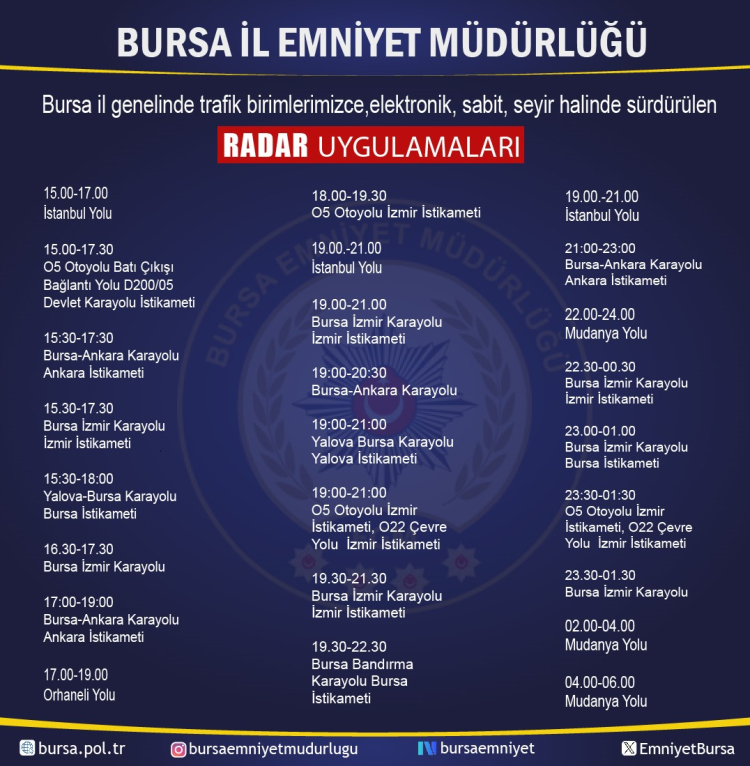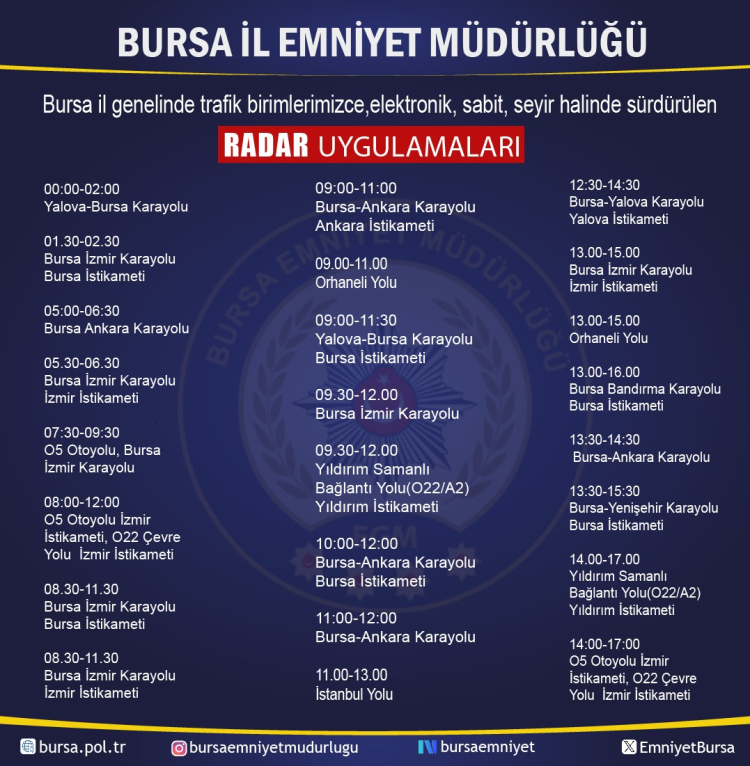 Bursa İl Emniyet Müdürlüğü, trafik güvenliğini sağlamak ve aşırı hıza bağlı kazaların önüne geçmek amacıyla il genelinde uygulanacak radar denetim noktalarını ve saatlerini kamuoyuyla paylaştı. Yapılan planlamaya göre denetimler, sabahın ilk ışıklarından gece yarısına kadar şehrin en kritik noktalarında 24 saat kesintisiz devam edecek.