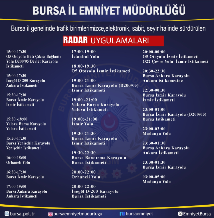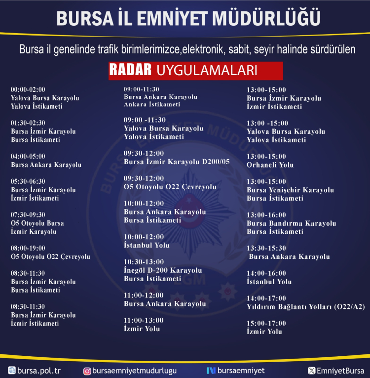Bursa'yı çevre illere bağlayan ana arterlerde ise günün neredeyse her saati radar uygulaması planlanmış durumda.