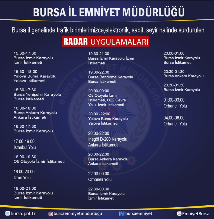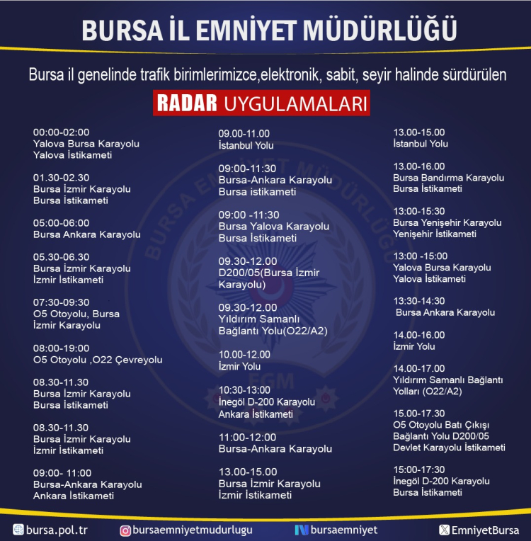 Emniyet birimleri, sadece gündüz değil gece saatlerinde de hız ihlallerine geçit vermeyecek. 08:00 - 19:00 saatleri arasında O5 Otoyolu ve O22 Çevre Yolu üzerinde sabit denetimler yapılırken; gece yarısından sonra Orhaneli Yolu üzerinde 01:00 - 06:00 saatleri arasında hız kontrolleri gerçekleştirilecek.