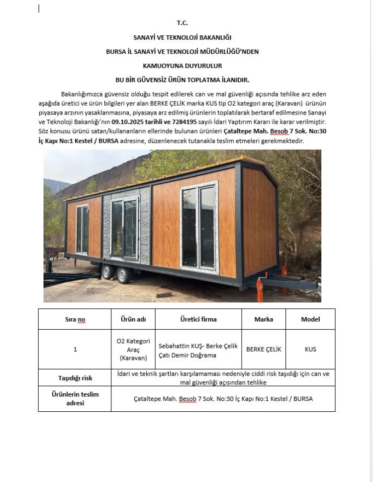 Aynı günlerde Bursa Sanayi ve Teknoloji İl Müdürlüğü tarafından bir başka toplatma kararı da karavan sektöründen geldi. Sabahattin Kuş - Berke Çelik Çatı Demir Doğrama firmasının ürettiği karavan modeli de teknik şartları karşılamadığı gerekçesiyle güvenlik riski taşıyor.