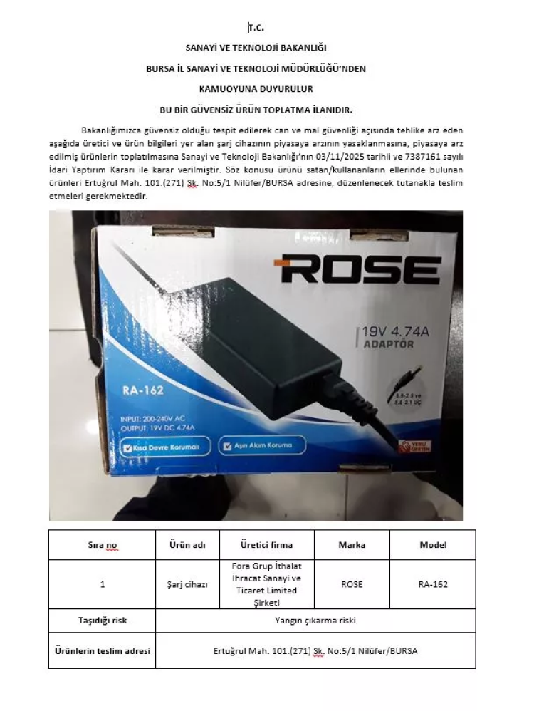 Yetkililer, ROSE RA-162 model şarj cihazının, teknik kusurları nedeniyle yüksek yangın çıkarma riski taşıdığını tespit etti. Bu tehlike nedeniyle Sanayi ve Teknoloji Bakanlığı, söz konusu ürünün piyasaya arzını tamamen yasakladı ve halihazırda satılmış olan cihazların toplatılması kararlaştırıldı.