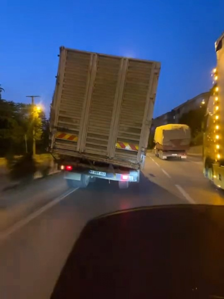 Kamyonun bu tehlikeli yolculuğu, trafikteki diğer sürücüleri paniğe sürükledi. Yan yatmış haldeki kamyonu gören vatandaşlar, olası bir kazadan endişe duyarak durumu cep telefonlarıyla kaydetti.