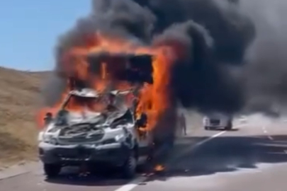 Kamyonet yangın sonrası büyük hasar görürken kazayla ilgili soruşturma başlatıldı.