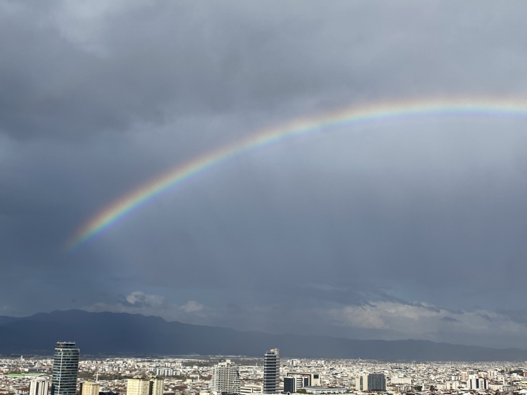 Bursa’da günün öğleden sonraki saatlerinde etkisini gösteren yağış, kısa süreliğine gökyüzünde eşsiz bir görsel şölene yol açtı. Yağmur bulutlarının dağılmaya başlamasıyla birlikte şehirde beliren gökkuşağı, özellikle yüksek binalar ve Uludağ silüetiyle birleşerek kartpostallık görüntüler oluşturdu.