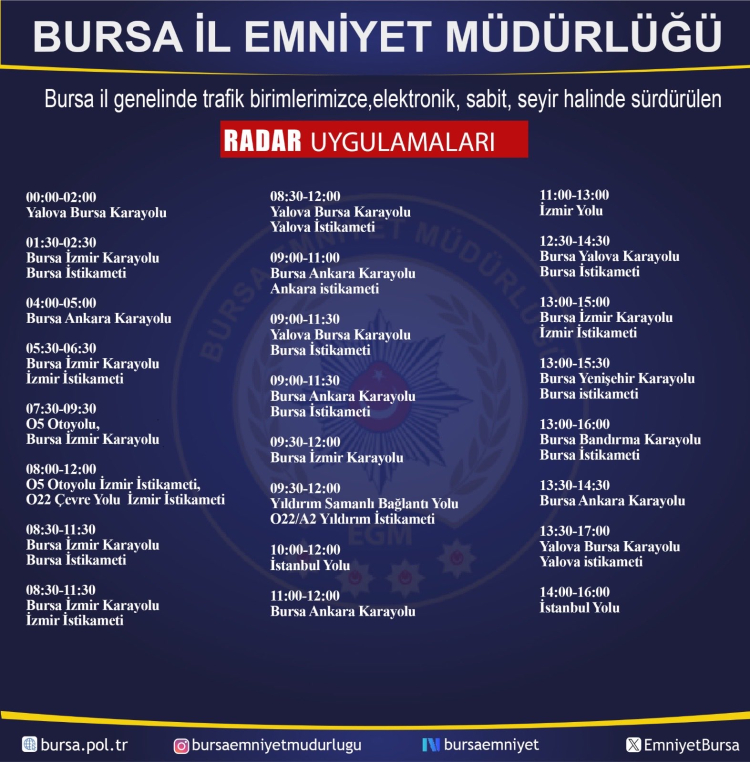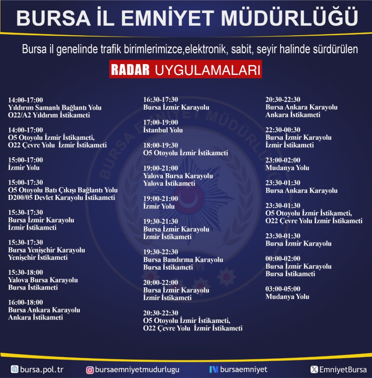 Bursa İl Emniyet Müdürlüğü’nden yapılan açıklamaya göre; 22.02.2026 tarihinde İzmir Yolu, Ankara Yolu, İstanbul Yolu ve Yalova Yolu üzerinde yoğunlaştırılmış radar kontrolleri yapılacak. Özellikle sabah saat 08:30 ile 12:00 arasında Yalova-Bursa karayolunda çift yönlü denetimler planlanırken; İzmir Yolu üzerinde günün farklı saatlerinde (11:00-13:00 ve 15:00-17:00 gibi) kontroller gerçekleştirilecek.