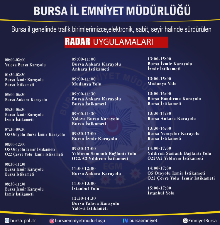Emniyetten paylaşılan verilere göre, denetimler sabahın ilk saatlerinden gece yarısına kadar şehrin en işlek karayollarında yoğunlaşacak. Özellikle Bursa-Ankara, Bursa-İzmir ve Yalova yollarında farklı zaman dilimlerinde birden fazla ekip görev yapacak.