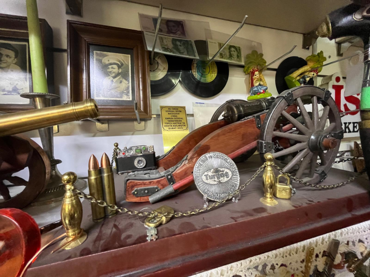 Topçu’nun koleksiyonunda yok yok… Osmanlı döneminden kalma yardım kumbaralarından, eski dönem askeri objelere; gazoz kapaklarından tarihi paralara, kartpostallardan saatlere kadar yüzlerce nadir parça, dükkânın vitrinlerinde yer alıyor. Topçu, “Bu kumbaralar mesela… Osmanlı döneminde, camilerde yardım toplamak için kullanılırmış. Üzerinde Arap harfleriyle yazılmış yazılar var. Her biri orijinal. Sadece bu bile, o dönemin sosyal yapısını anlamak için çok değerli.” diyerek koleksiyonundaki parçaların tarihî önemine dikkat çekti.