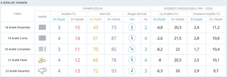 1991–2020 yılları arasındaki meteorolojik ortalamalara bakıldığında, Aralık ayının bu döneminde Bursa’da en düşük sıcaklıkların eksi 8 dereceye kadar gerilediği, en yüksek sıcaklıkların ise 22 dereceyi aştığı görülüyor. Mevsim normallerine göre bu hafta sıcaklıklar ortalama değerler civarında seyredecek.