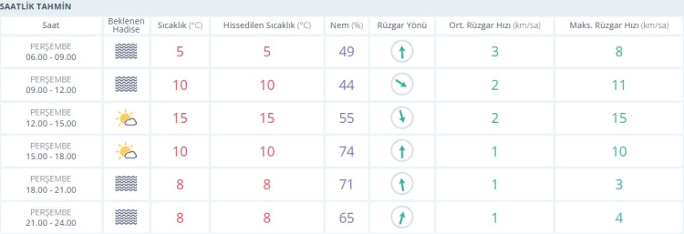 06.00 – 09.00: Sisli hava ile birlikte sıcaklık 5 derece, nem oranı yüzde 49 seviyesinde.