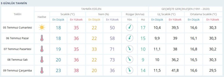 6 Temmuz Pazar: Hava sıcak seyredecek. En düşük 18°C, en yüksek 36°C. Nem %22-58 arasında. Ortalama rüzgar hızı 15 km/sa.