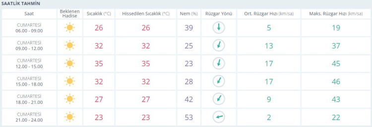 12.00 - 15.00: Günün en sıcak saatlerinde sıcaklık 35°C olacak. Nem %23, rüzgar 17 km/sa hızla esecek. Maksimum rüzgar hızı 45 km/sa’ye kadar çıkacak.
